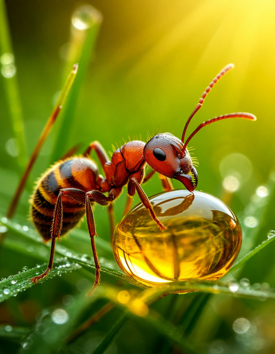 «Реалистичное изображение муравья рядом с каплей мёда. Крупный план: чётко видны лапки, усики, сегменты тела. Капля мёда прозрачная, янтарного цвета, отражает свет, создаёт блики. Лёгкая роса на травинках вокруг. Мягкий естественный свет, фон — размытая зелень травы и цветов. Высокая детализация текстуры хитина и вязкости мёда. Ultra HD, глубина резкости, фотореализм. Атмосфера тёплого летнего дня, естественная природная сцена» Вариант 2 (иллюстративный, сказочный стиль, 392 символа):