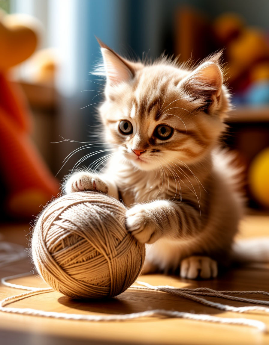 «Реалистичное фото: милый пушистый котёнок играет с клубком ниток. Крупный план — чётко видны мягкие лапки, любопытные глаза, усы. Клубок светло‑бежевого цвета, частично размотан, нити тянутся по полу. Мягкий дневной свет из окна, тёплые тени. Фон — размытый интерьер детской комнаты: деревянный пол, уголок игрушки. Ultra HD, высокая детализация меха и текстуры ниток, глубина резкости. Атмосфера беззаботного детства, естественная композиция» Вариант 2 (иллюстрация в мультяшном стиле, 391 символ):