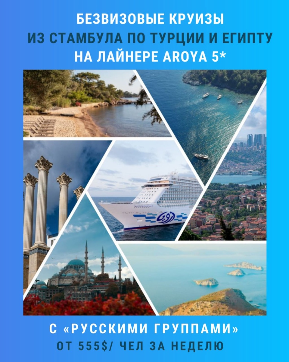 ! Проведите неделю в роскошном безвизовом круизе по Средиземноморью на лайнере Aroya 5*. Всего за 555$/чел можно отправиться в путешествие из Стамбула по знаменитым курортам живописной турецкой Ривьеры на современном лайнере и в составе «Русской группы». За 7 дней вы посетите лучшие курорты Турции (Бодрум, Мармарис, Каш) и Александрию в Египте. 🎁 В подарок — экскурсия по Александрии на русском языке. 🇷🇺 Чтобы ваш отдых был максимально комфортным, организованы «Русские группы» . ▶️ Маршрут: Стамбул, Турция – Мармарис, Турция – Бодрум, Турция – Каш, Турция – Александрия, Египет – Стамбул на 7 дн./ 8 н. Даты и цены (по тарифу «Спеццена компании». Все цены включают сервисный сбор): 💥 Безвизовый круиз по Средиземноморью с 06 по 13.06.26 При 2-х местном размещении: внутренняя каюта – 699$/чел балкон - 988$/чел Одноместное размещение: внутренняя каюта – 934$ /чел балкон – 1339$/чел При 3-х местном размещении: внутренняя каюта - 582$/чел балкон – 861$/чел 💥 Безвизовый круиз п