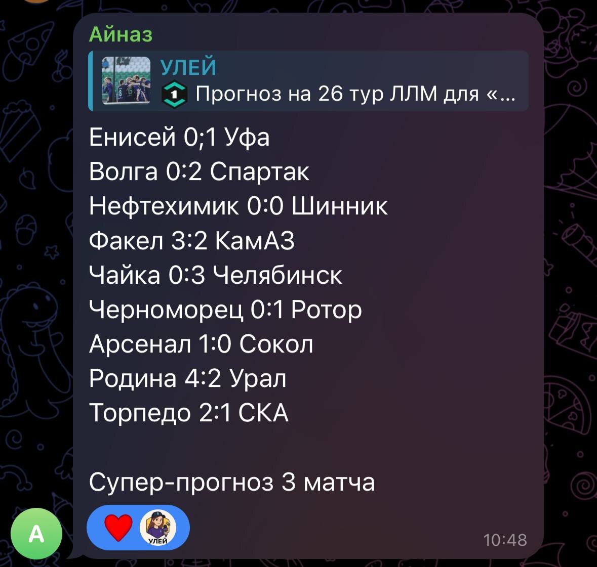 🥲 Слегка выпадаем из тройки лучших в «Битве каналов» До призовой зоны всего 1 балл, но и ниже плотность огромная. На следующий тур прогнозы сделает @aynazz38, набравший 10 баллов 👏 Заодно подсчитала баллы за разделённый 23 тур. Тут лучшим стал @belyi222 с 9 баллами. Пост с прогнозами — как всегда завтра в 18:01. Успевайте оставить комменты, тур стартует в 19:30. Напоминаю, что после старта конкретного матча прогнозы на него не засчитываются. #битваканалов