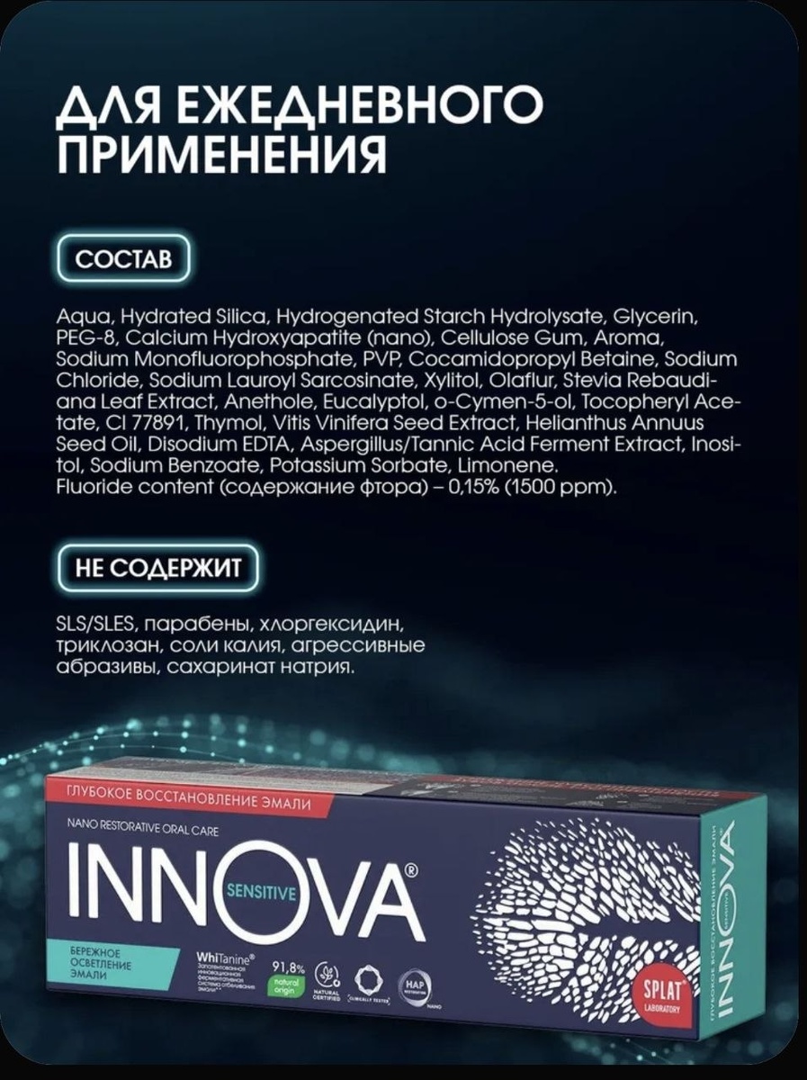 Главные активные компоненты:🔻 🕖Фтор — 1500 ppm (монофторфосфат натрия + олафлур) Рабочая взрослая концентрация. Профилактика кариеса, защита от деминерализации. 🕖Нано -гидроксиапатит Поддерживает реминерализацию эмали, снижает чувствительность. 🕖Ксилит Снижает активность кариесогенной флоры. 🕖Антисептический комплекс О-цимен-5-ол, тимол, эвкалиптол, анетол. Мягкая противовоспалительная поддержка для десны. 🕖Танназа Фермент против пигмента от кофе, чая, вина. Кому подойдёт: ✔️ Взрослым с риском кариеса ✔️ Пациентам с брекетами ✔️При имплантах ✔️ При лёгком гингивите ✔️ Любителям кофе и чая ✔️ После профгигиены для поддержания результата. Кому не лучший вариант 🔜Детям младше 6 лет 🔜При выраженной гиперестезии 🔜При аллергии на эфирные масла с осторожностью Подходит как ежедневная база. Сбалансированная профилактика: фтор + реминерализация + мягкая антисептика. Здоровые зубы:совет💪