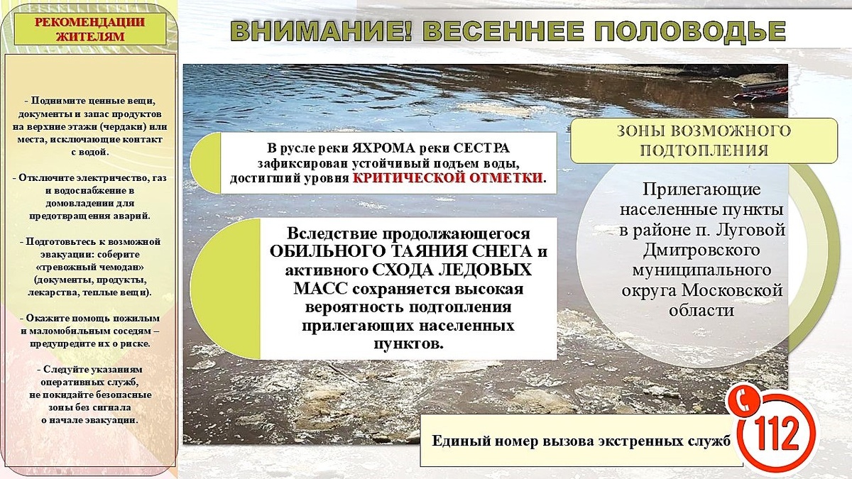 💦 В связи со сложными гидрологическими условиями, вызванными активным снеготаянием и интенсивным сходом ледовых масс, в Дмитровском муниципальном округе Московской области сложилась неблагоприятная обстановка. ⬆️По данным мониторинга, уровень воды в реках Яхрома и Сестра достиг критических отметок. В районе поселка Луговой сохраняется высокая вероятность подтопления прилегающих территорий. ☎️Важно! Если вы стали свидетелем нештатной ситуации или резкого подъема воды, незамедлительно сообщайте об этом по телефону 112. Подписаться на канал главы Дмитровского округа Михаила Шувалова 📱 Чтобы узнавать новости раньше, подписывайтесь на наш канал в МАХ @dmitrovreg