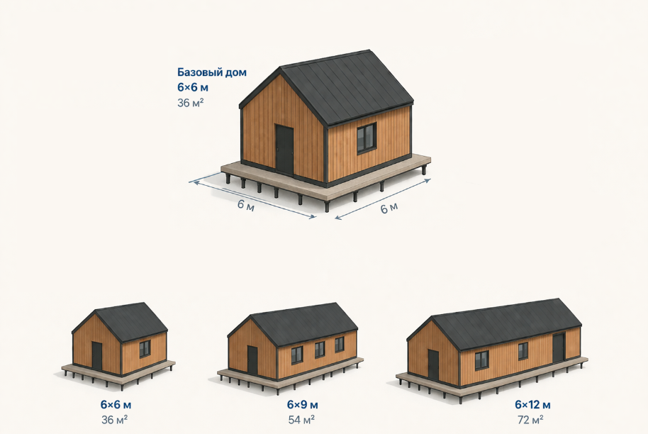 Это один из ключевых пунктов. Панели дома 6×6 должны по возможности подходить к дому 6×9. Панели дома 6×9 должны по возможности подходить к дому 6×12. То есть увеличение модели дома должно происходить за счет добавления новых элементов, а не полной смены системы.