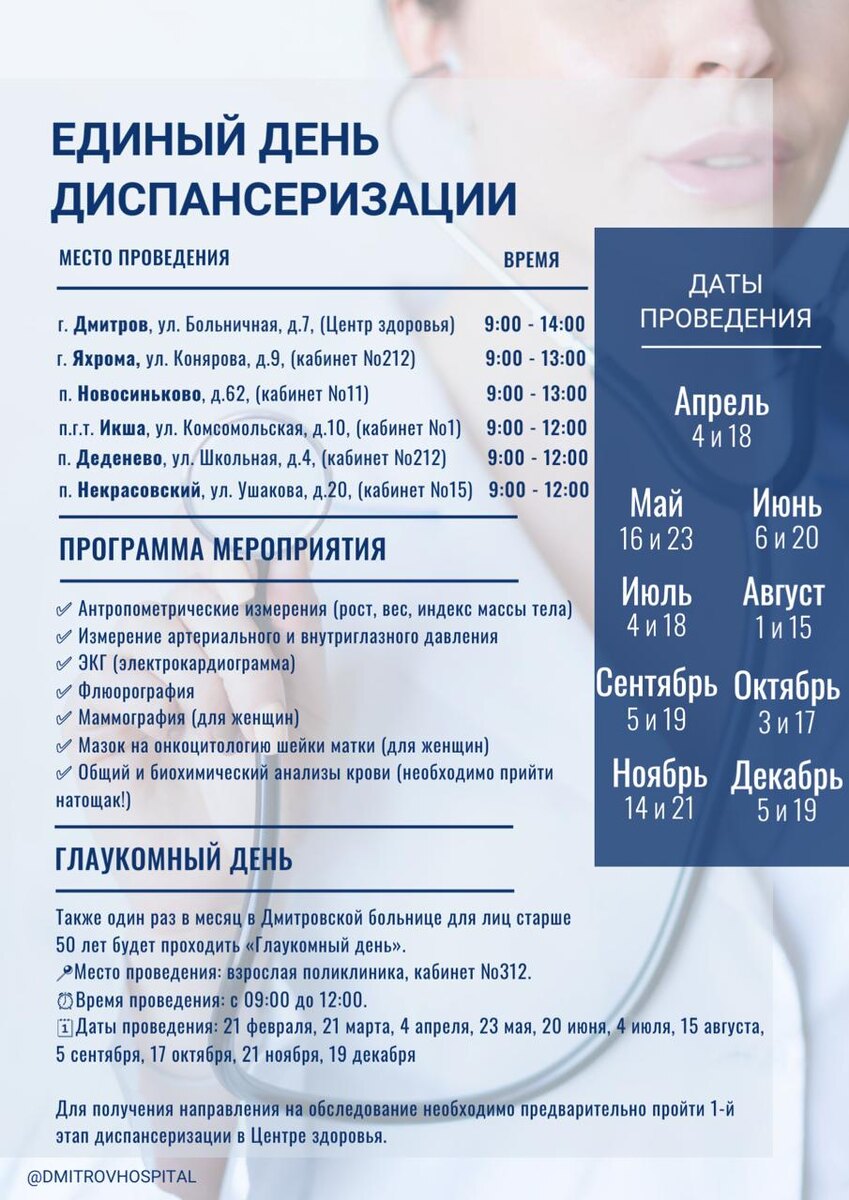 🩺 Мероприятие организовано для профилактического обследования населения, выявления факторов риска и заболеваний на ранних стадиях. 📍Адреса: 🔻Дмитров, ул. Больничная, д. 7 (3-й этаж, Центр здоровья) 9:00 – 14:00 🔻Яхрома, ул. Конярова, д. 9 (кабинет 212) 9:00 – 13:00 🔻Новосиньково, д. 62 (кабинет 11) 9:00 – 12:00 🔻Некрасовский, ул. Ушакова, д. 20 (кабинет 15) 9:00 – 12:00 🔻Икша, ул. Комсомольская, д. 10 (кабинет 1) 9:00 – 12:00 🔻Деденево, ул. Школьная, д. 4 (кабинет 212) 9:00 – 12:00 🔬 Что входит в обследование: - антропометрия (рост, вес, индекс массы тела); - измерение артериального и внутриглазного давления; - электрокардиография (ЭКГ); - флюорография; - маммография (для женщин); - мазок на онкоцитологию шейки матки (для женщин); - общий и биохимический анализы крови. ⬇️Как пройти диспансеризацию: - запись не требуется. - с собой паспорт и полис ОМС. - для сдачи анализов крови рекомендуется приходить натощак. Подписаться на канал главы Дмитровского округа Михаила Шувалова