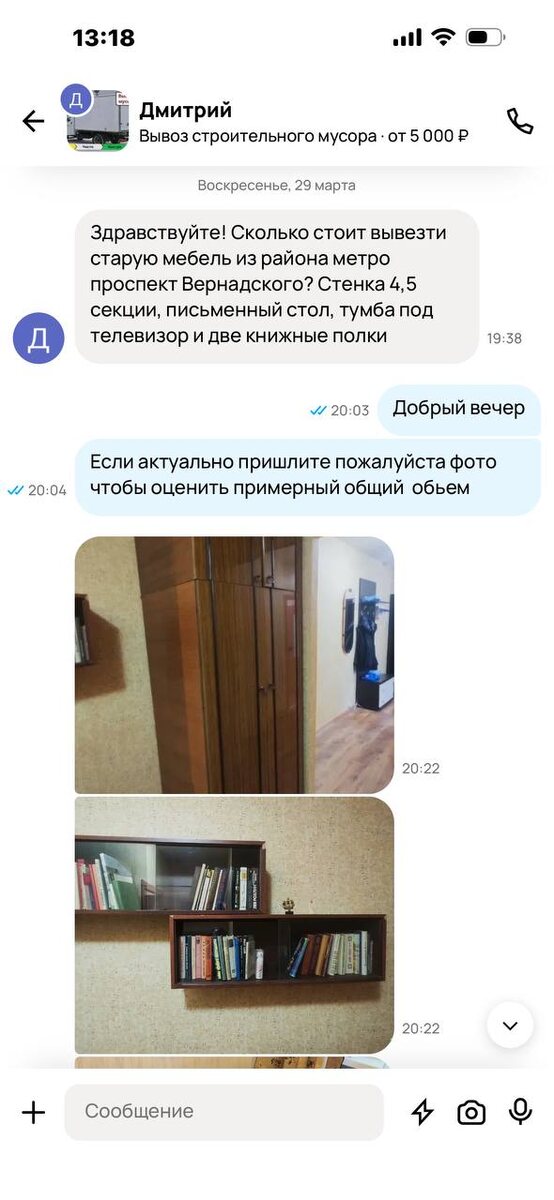 Примерно через 25 минут. И это уже риск. Потому что в этот момент клиент может писать ещё 3–5 исполнителям. Но дальше важно не просто «ответить». А правильно повести диалог. Первое, что я делаю — не называю цену. Я прошу фото. Почему это важно. Потому что текст «стенка, стол, тумба»