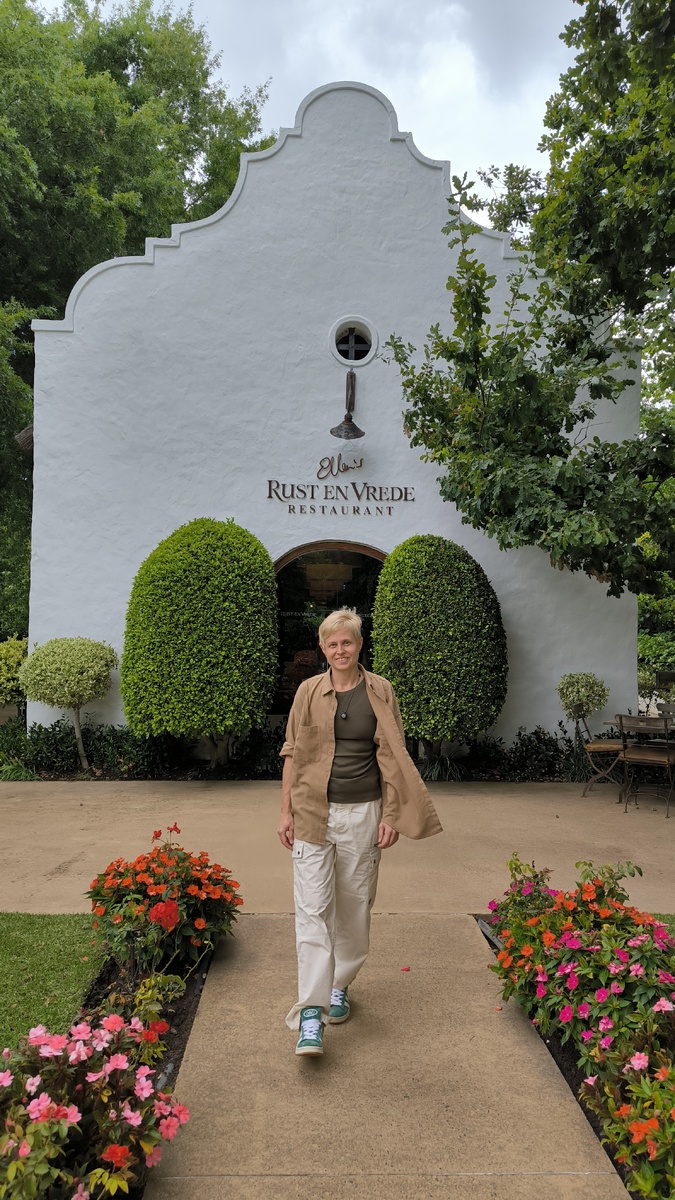 Rust en Vrede Wine Estate - это был тот самый долгожданный опыт, ради которого точно стоит приехать в Стелленбош. Место с безупречной атмосферой: живописные виды, ухоженная территория и ощущение спокойной, «дорогой» винодельни, где всё продумано до мелочей. Обед здесь проходит в формате живой очереди - без бронирования начиная с 12:00. Хотя посадочных мест достаточно, к обеду поток людей заметно увеличивается, и всё быстро заполняется. Мы приехали заранее, около 11:00, спокойно прогулялись по территории и без спешки заняли столик - это, пожалуй, лучший сценарий, если не хотите ждать. Обслуживание приятно удивило: всё было очень слаженно, быстро и при этом без ощущения суеты. Видно, что команда работает как часы. Вина здесь нельзя назвать бюджетными, но они однозначно стоят своих денег - чувствуется уровень и качество. Территория винодельни включает открытую веранду, дегустационный зал, ресторан и виноградники, уходящие за горизонт. Нам даже провели небольшую бесплатную экскурсию по пог