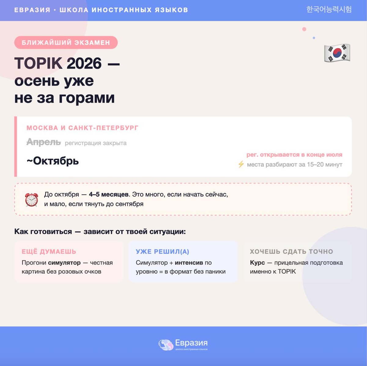 ! Да-да, это про экзамен TOPIK. Весенняя сессия в России уже закрыта. Если ты пропустил регистрацию — у тебя остался один-единственный шанс в этом году. 📍 Где и когда: Октябрь 2026, Москва и Санкт-Петербург. ⚠️ Главный нюанс: Регистрация откроется в конце июля. Места разлетаются очень быстро. Опоздал — ждешь 2027 год. До октября 4–5 месяцев. Это много, если начать сейчас. И катастрофически мало, если тянуть до сентября. В Евразии есть несколько форматов — под разные цели и уровни. 1️⃣ Симулятор TOPIK Это полная демо-версия экзамена: строгий тайминг и аудио, которое нельзя поставить на паузу. Помогает узнать свой реальный балл и привыкнуть к стрессу до того, как вы окажетесь в аудитории. 2️⃣ Интенсив на интерактивной платформе Вариант для тех, кто уже записан на экзамен. Точечно разбираем слабые места и «натаскиваем» на формат заданий, чтобы не терять время на лишние раздумья. 3️⃣ Курс подготовки Основательная работа: лексика, грамматика и стратегии решения каждого раздела (чте