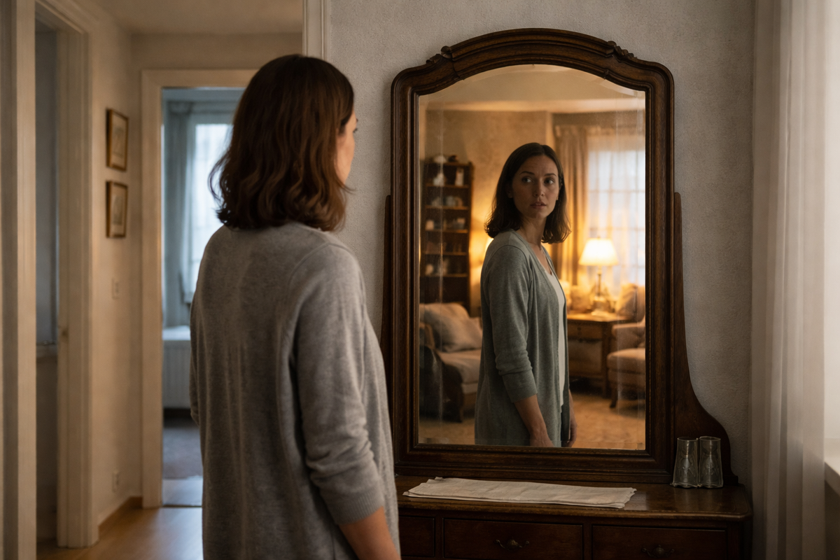 Кран на кухне подкапывал, холодильник гудел ровно, дом после вечернего отключения света будто ещё не пришёл в себя. Ася держалась за дверную ручку так крепко, что ногти вдавились в ладонь, и всё смотрела на стекло, не решаясь сделать ни шаг вперёд, ни шаг назад. В квартире было темно, только над раковиной дрожал бледный отсвет с лестничной площадки. А в отражении свет падал жёлтый, тёплый, домашний, и от этого внутри делалось не по себе.