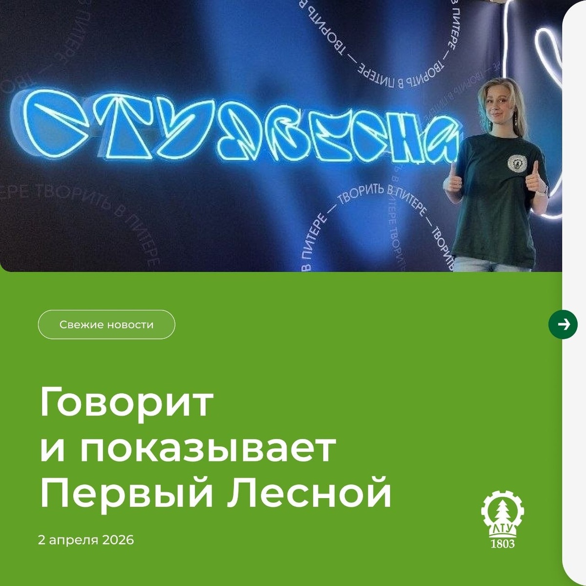 Собрали для вас свежие новости и анонсы 👇 🎨 Студенты СПбГЛТУ создадут мультимедийные инсталляции в центре «Россия — Моя история» — занятие по курсу «Виртуальная инсталляция» прошло в музейно-выставочном центре. Подробнее — на сайте СПбГЛТУ 🎤 Студвесна в городе: СПбГЛТУ на региональном этапе фестиваля — наш университет в направлении «Вокал» представила студентка ИЛАСиОД Полина Сорокина. Подробности — в МАХ 🌲 Развитие продукта в ЛПК: открытая лекция Виталия Липского — 31 марта генеральный директор НАРИ провёл лекцию о стратегиях диверсификации, лоббизме и стандартизации. Подробнее — на сайте СПбГЛТУ 🗣️ Приметы и суеверия: встреча Разговорного клуба — 30 марта студенты обсудили русские приметы, поделились традициями своих стран и анонсировали грядущие мероприятия. Подробности — в МАХ 🏛️ Сады и парки Петербурга: конференция на английском языке — 1 апреля студенты представили доклады об истории и перспективах зелёных зон города. Подробнее — на сайте СПбГЛТУ Следите за новостями