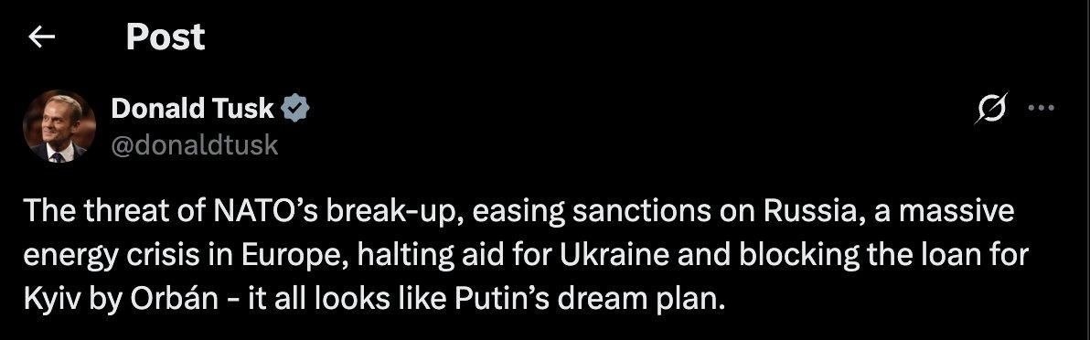 кредита для Киева со стороны Орбана - все это выглядит как план мечты Путина" Премьер-министр Польши Туск привычно думает о Владимире Путине, а не переживает за своих сограждан столкнувшихся с резким ростом цен.