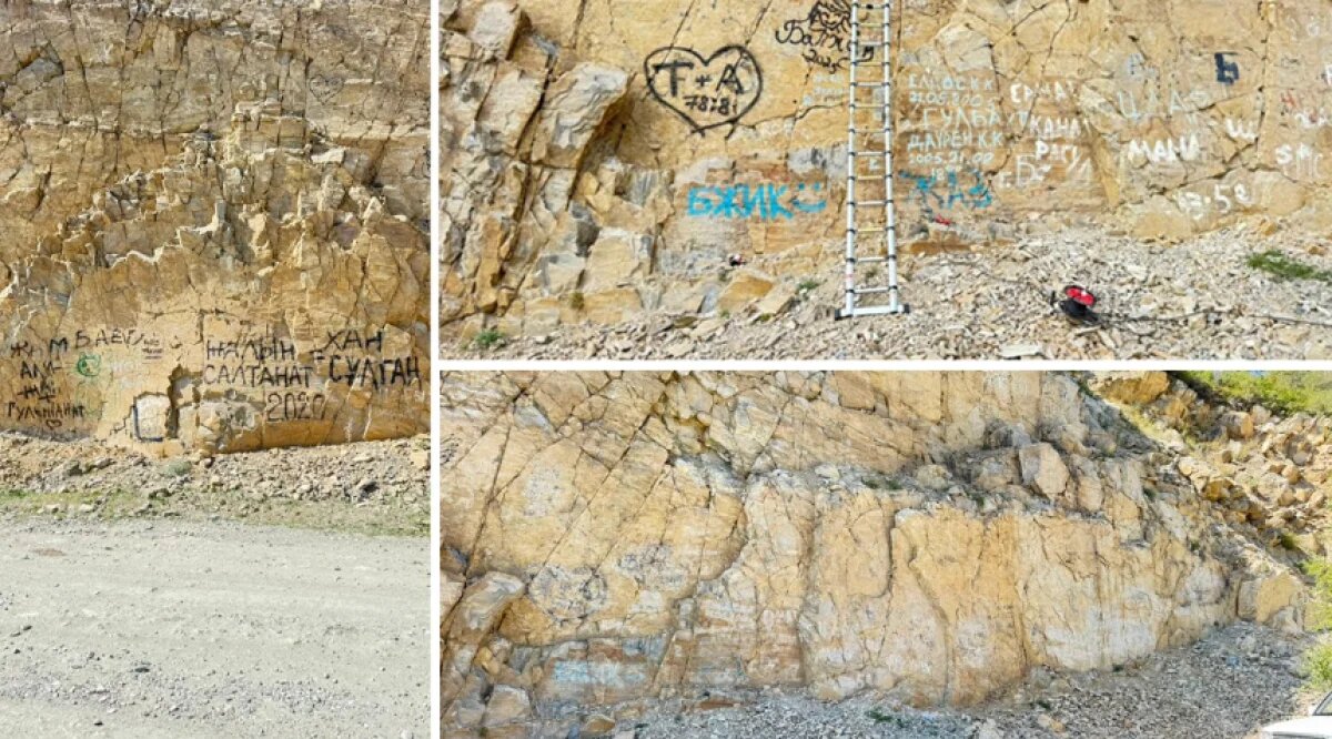 — Сколько времени заняла экспедиция и какие трудности возникли? — Мы выехали с семьей в Катон-Карагайский район. Общая протяженность маршрута составила около 1,5 тысячи километров, и вся поездка заняла примерно семь дней. За это время нам удалось очистить Старо-Австрийскую дорогу фактически убрать все надписи, которые там были. Также работали на участке перевала Мраморный: это в сторону Китая, если ехать от Маркаколя. Там, пожалуй, была самая сложная ситуация, вся скальная стена была исписана.