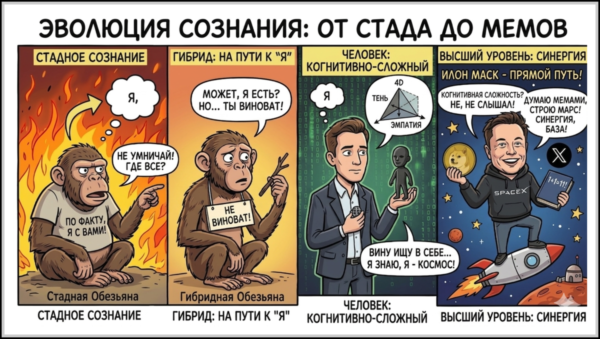 Вопрос на засыпку: А вам часто доводилось видеть, как человек проходит полный путь эволюции сознания — интегрирует тень и становится когнитивно сложным? На ваш взгляд, это реальный сценарий или такое встречается так же редко, как возникновение новой Солнечной системы?