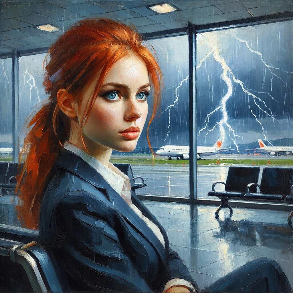 За окнами терминала бушевала непогода, словно природа устроила грандиозный спектакль. Ветер завывал, раскачивая деревья, и они стонали, как живые существа, вторя грозовым раскатам. Стеклянные фасады терминала дрожали, превращаясь в дрожащие зеркала, по которым стекали потоки дождя, словно слёзы небес. Молнии пронзали небо, освещая его зловещим светом, и гром глухо ухал, словно древние барабаны, где-то за бетонными перекрытиями. Внутри аэровокзала царил привычный шум ожидания: гудение голосов, шарканье подошв по полу, монотонные объявления о переносе рейсов, которые звучали как предупреждения о надвигающейся буре.
