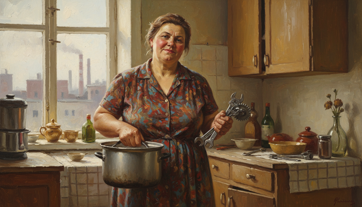 Советские женщины выработали целую культуру эффективности. Борщ варился сразу на три дня. Пирожки лепились в выходной, чтобы хватило на всю неделю. Вещи перешивались, перелицовывались, передавались младшим детям. Ничего не выбрасывалось. Это было не бережливостью в западном смысле — это было выживанием.