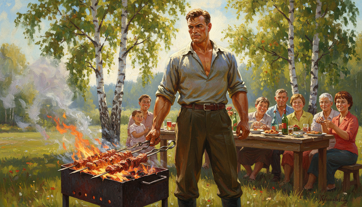 Мангал — это не еда. Это ритуал. Советский мужчина у мангала — это царь, добытчик, хозяин положения. Дым, мясо, огонь. Всё по-настоящему. А вот борщ — это уже не его история. Борщ варила жена. Каждый день. Молча. Я долго думала: почему одно и то же действие — приготовление еды — в зависимости от места и контекста превращалось в совершенно разные социальные роли? На природе: мужчина-кормилец. На кухне: немужское занятие. Это не случайность. Это очень продуманная система. В советском обществе кухня была женским пространством по умолчанию. Не потому что так написано в законе — а потому что так сложилось исторически, закрепилось в быту и транслировалось из поколения в поколение как норма. Женщина работала наравне с мужчиной. Это было требованием советской идеологии: равноправие, труд, строительство коммунизма. Но приходя домой, она снова вставала к плите. Двойная смена — так это назвали социологи. Мужчина мог не уметь сварить яйцо — и это не считалось недостатком. Это считалось нормой. Муж