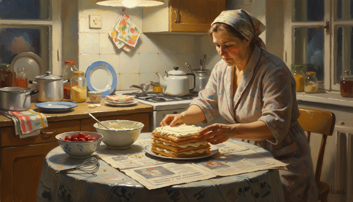 Она достала форму из духовки в час ночи. Завтра — день рождения дочери. Торт ещё только первый слой. Впереди — ещё одна ночь, ещё один день у плиты, и только потом — стол. Так выглядел советский праздник изнутри. Не как на открытке. Как на кухне. В СССР день рождения был одним из немногих поводов, когда семья позволяла себе что-то настоящее. Не казённое, не коллективное, не по разнарядке. Своё. И именно поэтому к нему готовились так, будто от этого зависело что-то важное. Торт «Наполеон» — это не рецепт. Это ритуал. Тесто раскатывали скалкой на столе, застеленном газетой. Коржи — тонкие, хрупкие — выпекали по одному, каждый отдельно. Крем варили на медленном огне, помешивая без остановки, чтобы не пригорел. Потом слои складывали один за другим, и торт уходил под гнёт на ночь — пропитываться. Двое суток. Это был минимум. И дело не в том, что других тортов не существовало. «Прага», «Медовик», «Птичье молоко» — всё это тоже пекли дома. Просто «Наполеон» был особым. Он требовал терпения.