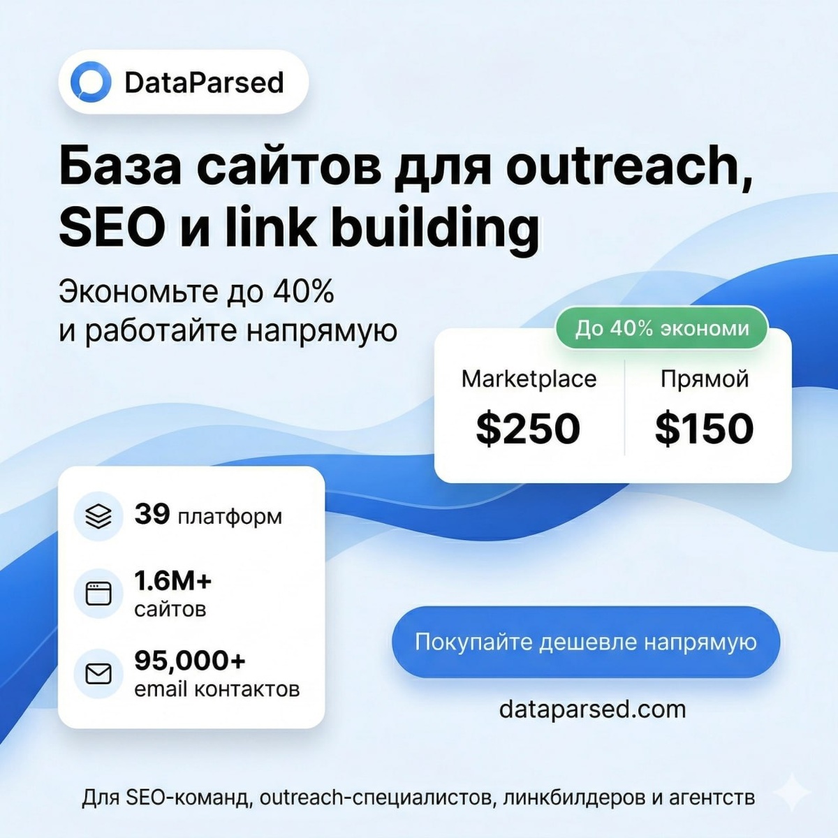 Для SEO-команд, outreach-специалистов, линкбилдеров и агентств. Агрегированная база сайтов с outreach / guest post / SEO marketplace-платформ в одном файле. Поиск, фильтрация и прямая работа с площадками. Экономия до 30–40% по сравнению с размещением через marketplace-платформы. 🟢 В базе: — 39 платформ — 1 651 283 сайтов — 423 772 уникальных сайта — 93 807 валидных email — 1–5 email на сайт 🟢 Основные поля и фильтры: — Domain, Price, Traffic, DR, Link type, Category / Theme, GEO, Gambling type, Site type 🟢 Формат: Excel 💰 Цена: — без контактов: $300 — с email: $500 Пример базы: https://docs.google.com/spreadsheets/d/1Z0gQv5PY6T5K8_1XW60TGxytEaTEjpJg888iuPvmmbE/edit?gid=0#gid=0 @wilsonWork https://dataparsed.com/