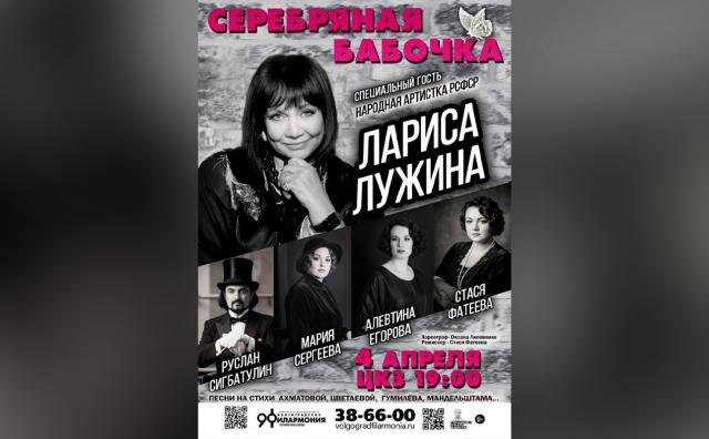 Центральный концертный зал Волгограда приглашает на театрализованный концерт под интригующим названием «Серебряная бабочка». Ещё более интригует тот факт, что специальным гостем на этом празднике будет замечательная актриса, народная артистка РСФСР Лариса Лужина, которая исполнит творения гениальных Анны Ахматовой и Марины Цветаевой.