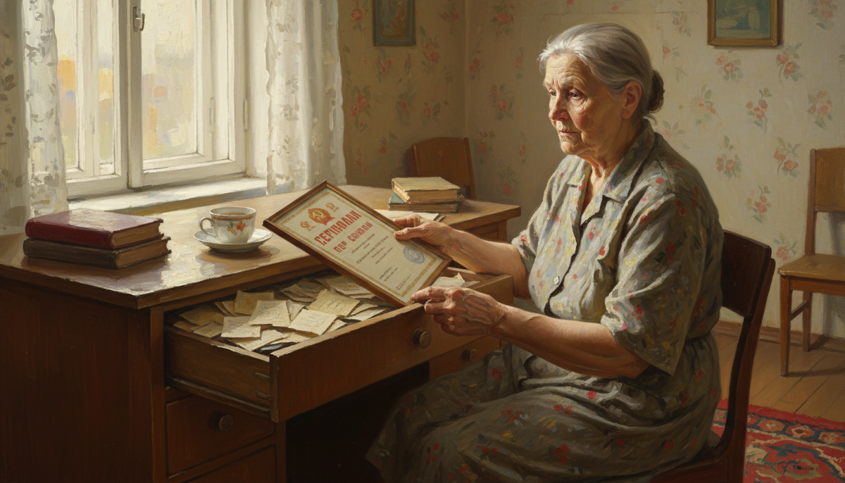 Грамота лежала в ящике стола. Не в рамке на стене — в ящике, под старыми квитанциями. Александра Петровна проработала на текстильной фабрике двадцать семь лет, получила эту бумагу на юбилее предприятия и убрала её подальше. Не из обиды. Просто некуда было вешать.