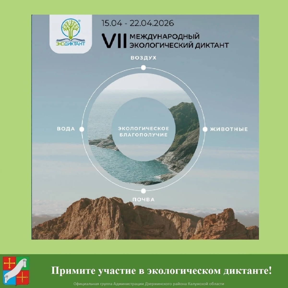 Старт уникального просветительского проекта приурочен ко Дню экологических знаний 15 апреля, а финал — к Дню Земли 22 апреля. Главной темой этого года выбрано «Экологическое благополучие». Диктант можно написать на русском и английском языках: - онлайн на портале https://clck.ru/QxExd с 15 по 22 апреля (включительно) из любой точки мира в удобный для вас день и час; - офлайн на площадках в вашем городе (населенном пункте), который можно будет найти на портале после начала регистрации. Дата начала регистраций на портале – 2 апреля. Все участники, независимо от результата, получат сертификаты. Победители будут награждены дипломами I, II и III степени.