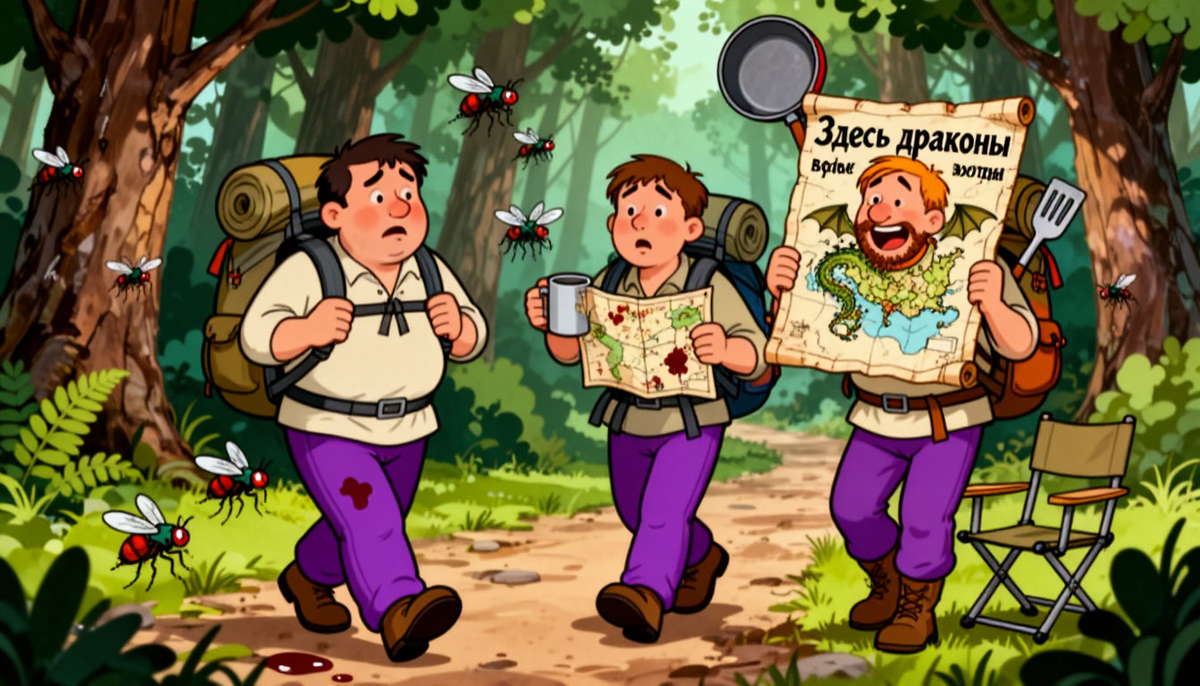 В лето такое‑то, в месяц, когда комары становятся злее драконов, а мошкара тучами носится над землями, собрались три друга могучих в поход на природу идти. Звались они: И молвил Савва Могучий: — Эй, други! Пойдём в леса дремучие, к звёздам небесным, подальше от городов шумных, где сети волшебные не ловятся! И откликнулся Игорь Мудрый: — Истинно так! Карта у меня есть, ещё дедом моим начертанная, путь верный укажет! Яромир Весёлый же лишь хохотал да в ладоши хлопал: — А я припасы взял — тушёнки три банки, макарон мешок да чай в термосе, чтоб душу согревать! Отправились они в путь. Но едва в лес вошли, как начались беды. Тропа, что на карте была прямой да гладкой, оказалась извилистой, как змея лукавая, и ухабистой, как спина старого медведя. Савва Могучий, спотыкаясь о корни древесные, возопил: — Да куда ж мы идём, о мудрейший?! Это не тропа, а испытание от самого Лешего! Игорь Мудрый, карту разглядывая, отвечал: — Всё верно, други! Вот тут речка, вот тут холм… — А вот тут, — перебил ег