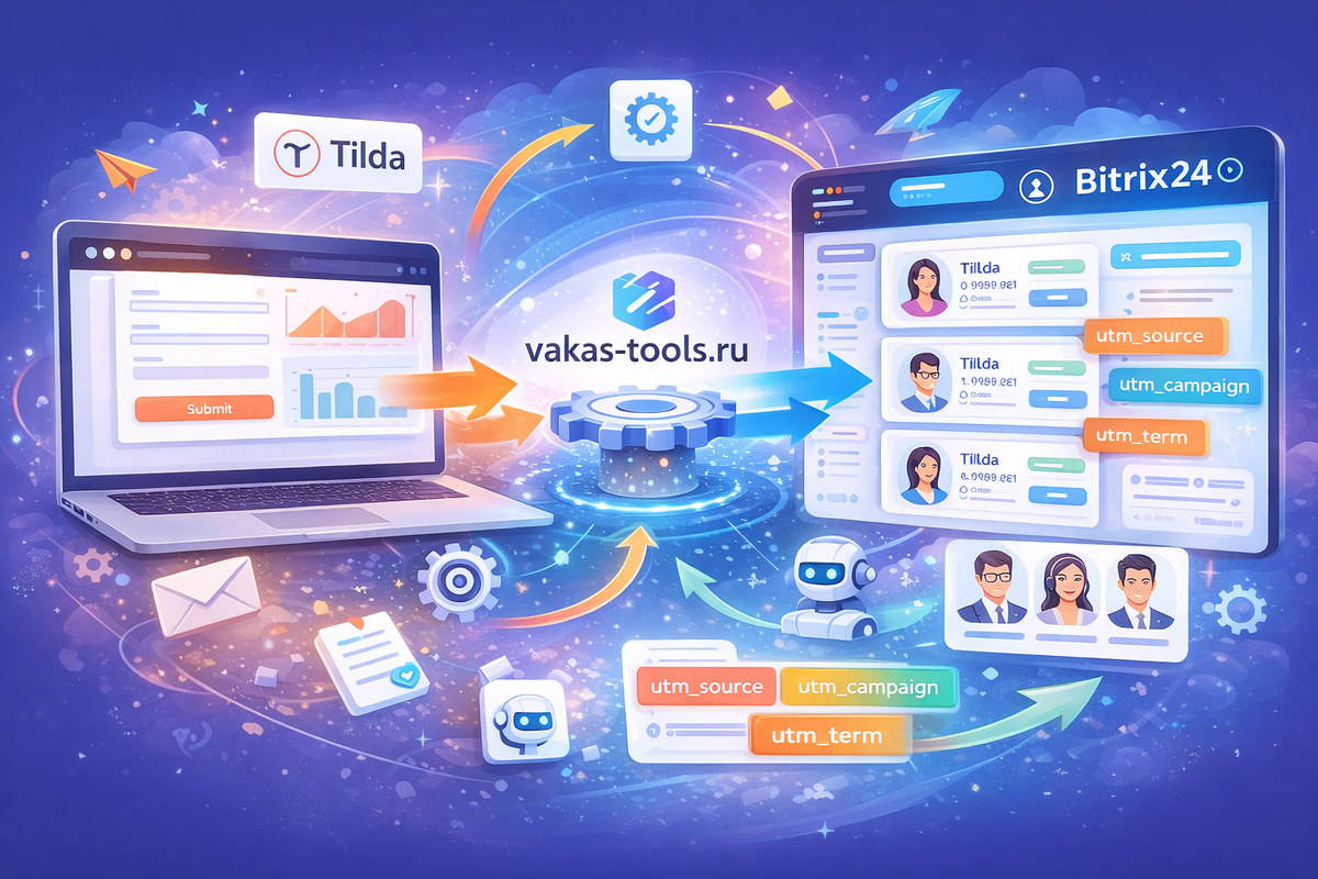 Запуск трафика на сайт часто вскрывает одну и ту же проблему: маркетинг генерирует лиды, а отдел продаж тонет в хаосе. Заявки падают на почту, менеджеры вручную заводят карточки в Битрикс24, забывают перенести UTM-метки, а из-за системных сбоев часть регистраций просто теряется. Для владельцев онлайн-школ базовая передача данных - это всегда потеря времени и бюджета. Разбираем, как настроить полноценный шлюз между Tilda и Битрикс24 через платформу vakas-tools.ru, чтобы автоматизировать рутину, сохранить сквозную аналитику и экономить команде по 2-3 часа в день. В отличие от стандартных настроек, которые часто передают данные криво или не полностью, Vakas-tools (Вакас-тулз) работает с логикой самого Битрикс24. Система забирает 100% информации из форм Tilda и автоматически создает нужные карточки: контакты, лиды или готовые сделки. Для технических специалистов и маркетологов здесь зашито сразу несколько критически важных возможностей: Гибкие правила позволяют закрыть любой процесс и обра