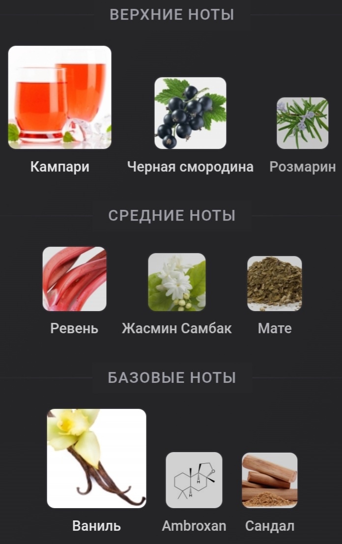--Верхние ноты — кампари, чёрная смородина и розмарин. Это как взрыв горько-сладкого ликёра Кампари и немного кислинки от смородины. Розмарин не даёт скатиться аромату в приторное варенье, даёт чуток хвойной (еле слышной) свежести.