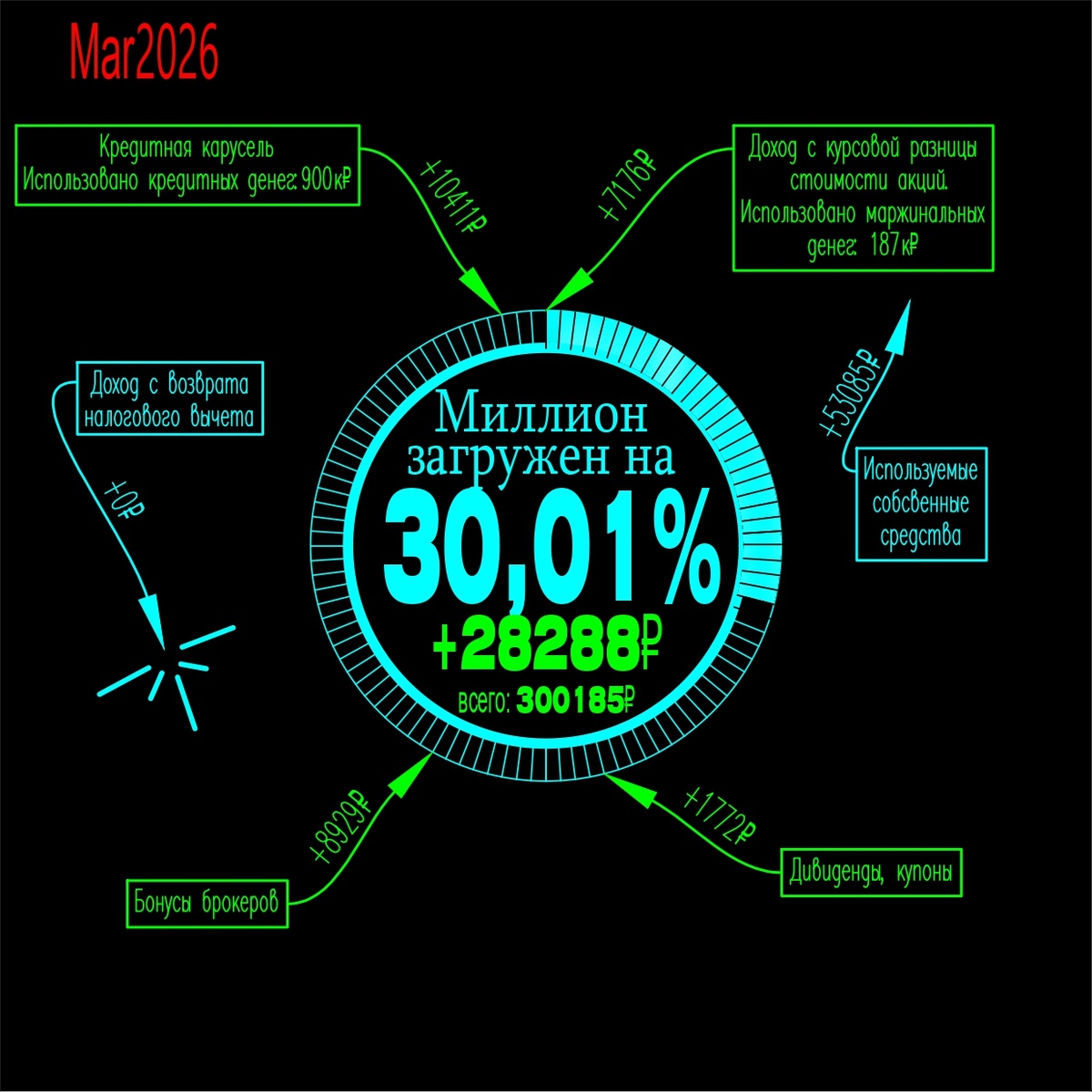 0. Получил рекордную доходность за всю историю цели) 1. Мои вычеты по ИИС в 20к одобрили, жду выплат, с самым большим ИИС на 52к возникли проблемки. Налоговая не хочет произвести вычет по упрощенке, придется разбираться и подавать вручную. 2. Открыл брокерский счет на Совкомбанка на жену, для акции 26к₽ за 10 месяцев инвестиций. 3. Бонусы получил от брокера альфы, это и от "альфы челленджа" и по акции 10к₽ за 10 месяцев за новый брокерский счет. 4. Получил дивиденды, все обратно на ИИС для возвратов в 2027 году. 5. Получил бонусы от открытия двух брокерских счетов в сбере, суммарно более 6к₽. 6. Получил бонусы от открытия на себя брокерского счета совкомбанка в размере 1,3к₽ 1. Разобраться с ИИС мамы. 2. Получить подарочные акции аэрофлота, за инвестиции (счет более 70к₽ в течении месяца) в размере 1к₽. 3. Вкидываю всю прибыль в дивидендные акции