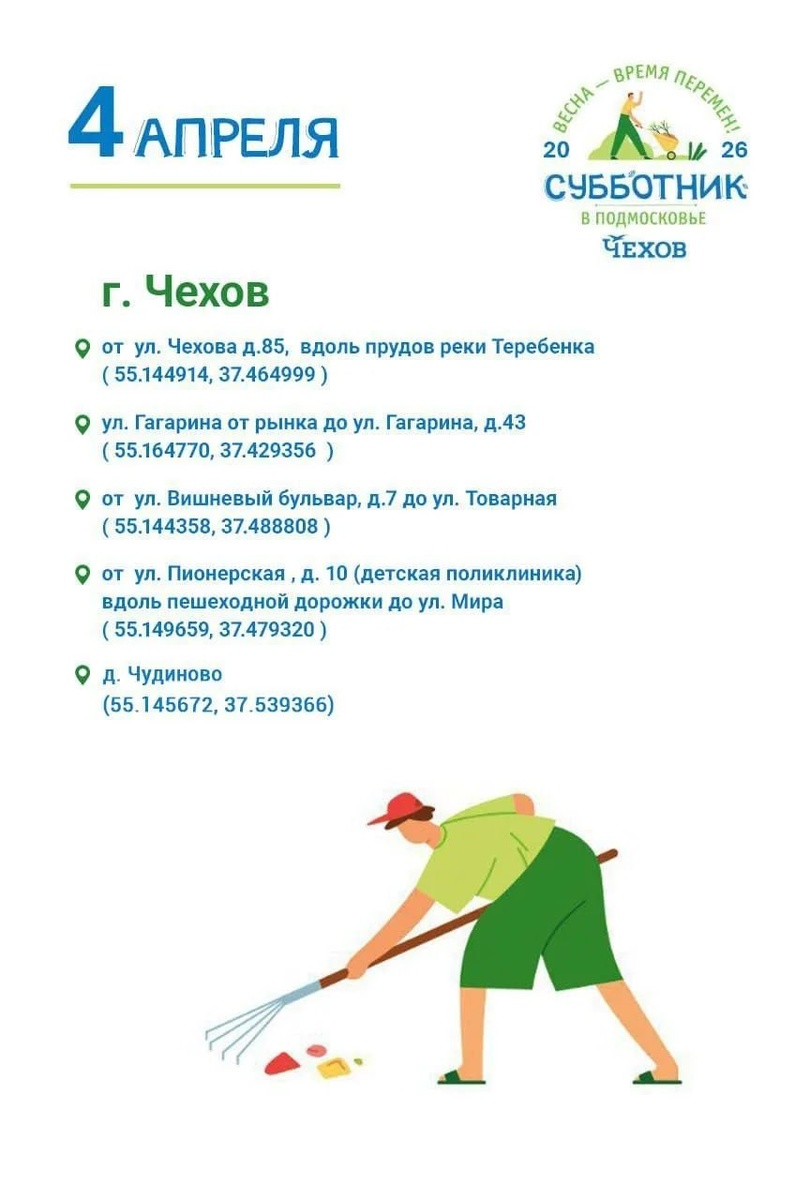 ✨ Субботник - 4 апреля 🧹 💫Субботник состоится 4 апреля в 10:00 по следующим адресам: - ул. Чехова д. 85, вдоль прудов реки Теребенка 55.144914, 37.464999 - ул. Гагарина, от рынка до д. 43 55.164770, 37.429356 - ул. Вишневый б-р, д. 7, до ул. Товарная 55.144358, 37.488808 - ул. Пионерская, д. 10, до ул. Мира 55.149659, 37.479320 - д. Чудиново 55.145672, 37.539366 👉🧹На субботнике участников обеспечат необходимым инвентарем. Сделаем город чище 👍 📆 04.04.2026 🕛 10:00 ⭐Поддержать канал голосом ✅ Мероприятия Чехов https://dzen.ru/id/66cc4b48e9ef144699238a51 https://vk.ru/chekhov_events http://dzen.ru/chekhov_events