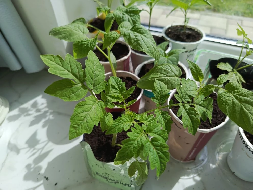 Здравствуйте, друзья! Утро нас сегодня встретило замечательным ярким солнцем. Оно светило в наше окно так жизнерадостно и тепло, что на миг показалось, что уже лето и пасмурная погода далеко позади. Пока я «просыпался и раскачивался», Лена занялась рассадой. Рассада у нас стоит как раз под этим панорамным окном в пол. Место для нее хорошее, рассада не сильно тянется и растет крепкой и здоровой. Я сегодня первый раз обратил внимание на томат, листья которого похожи на листья картофельной ботвы, спросонья мне показалось, что это рассада баклажана, который вдруг резко вырос. На баклажан это тоже, конечно, не похоже. Рассада, конечно же, и у нас вытягивается, солнечный день все еще очень короткий. Лена сажает рассаду в стаканчики, которые сначала заполняются землей наполовину, а потом, по мере роста побегов, досыпаются. Поэтому кажется, что рассада совсем не вытягивается. Засыпаем землей не только рассаду томатов, но и перцев. Некоторые огородники считают, что перцы присыпать землей нельз