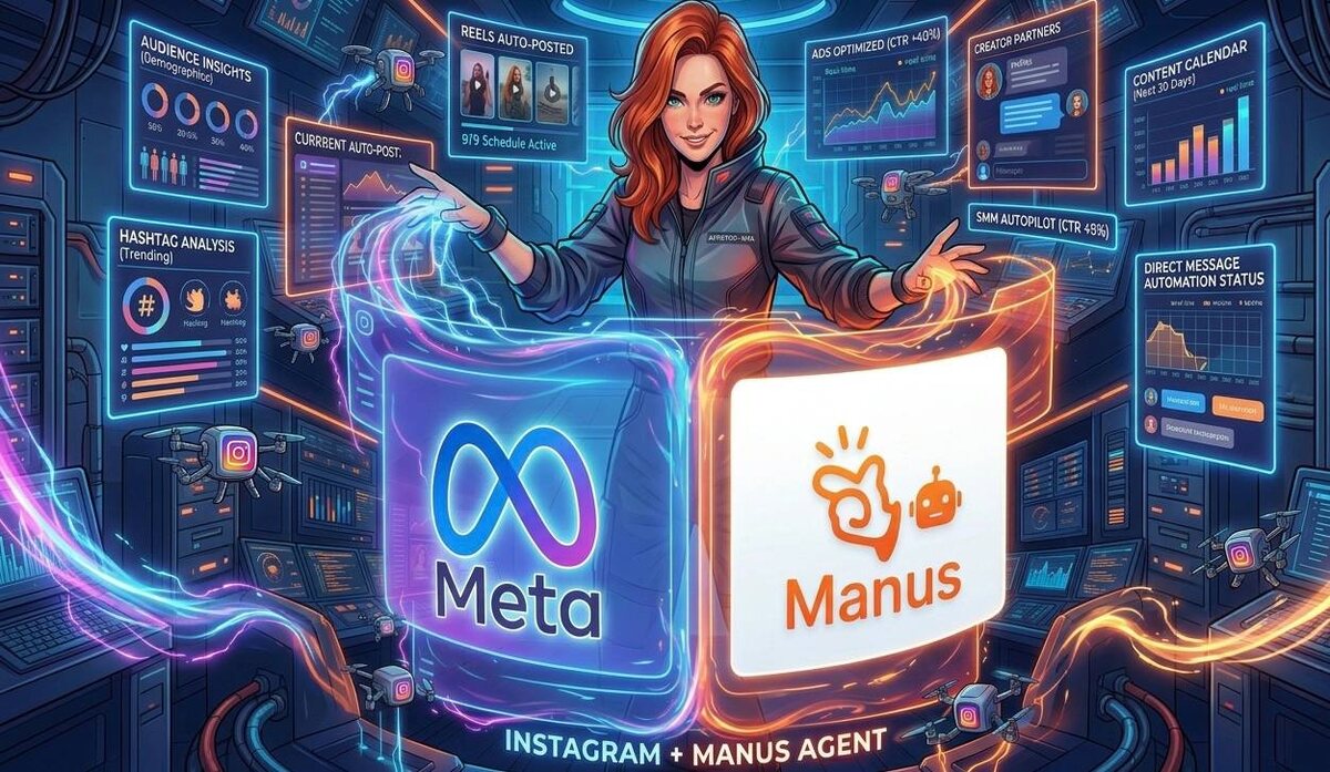 ⚡️ РЕБЯТА, КТО ВЕДЁТ ИНСТУ - ЭТО КРЫШЕСНОСНАЯ НОВОСТЬ! 🤯🔥 Всё, эпоха «просто нейросетей» закончилась. Началась эра настоящих Агентов. Meta купила Manus AI (сделка на $2+ млрд в конце 2025). И это значит, что Instagram и реклама Meta скоро (а для кого-то уже сейчас) перейдут на совершенно новый уровень автономности. Я сама затестила Манус и он реально зашёл в мой Instagram, сделал глубокий анализ блога, выдал рекомендации по контенту и готовый контент-план. Это не просто чат-бот. Это General AI Agent, который умеет действовать. 😳 Что он уже может (и это не фантастика): ✅ Сам анализирует охваты, вовлечённость и паттерны — не просто цифры, а почему один Reels залетел, а другой провалился. ✅ Берёт исходник, делает монтаж, субтитры, адаптирует под стиль и готовит к публикации. ✅ Через коннекторы работает с Ads Manager: анализирует кампании в реальном времени, находит проблемы, предлагает правки и новые креативы. ✅ Планирует контент, ищет инсайты и помогает перейти от рутины к стр