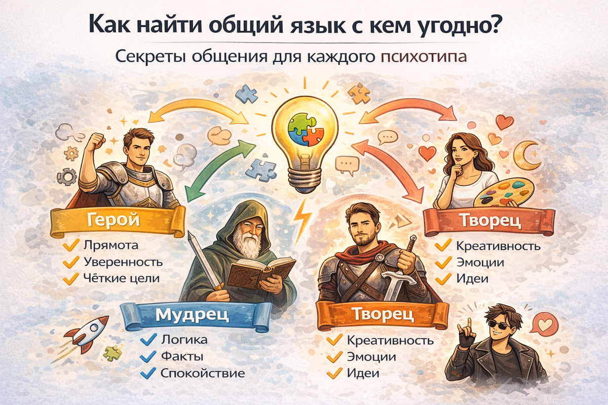 Вы когда-нибудь говорили человеку: «Давай просто по существу!», а он обижался? Или наоборот, начинали издалека и с чувствами, а собеседник засыпал? Знакомая боль? Дело не в том, что люди плохие или вы не умеете общаться. Просто у каждого свой психотип, свой «входной фильтр». Узнайте, как говорить на языке другого человека — и конфликты уйдут, а взаимопонимание появится даже с теми, кого раньше вы считали «невыносимыми». Логик любит факты, цифры, причины и следствия. Эмоции для него — лишний шум. Как его узнать: говорит по делу, не любит «воду», может прервать, если вы начинаете о чувствах. В споре опирается на логику. Как общаться: Чего избегать: жалоб, манипуляций «ты меня не понимаешь», долгих вступлений. Этик живёт эмоциями и отношениями. Ему важно, комфортно ли всем, как вы к нему относитесь. Как его узнать: спрашивает «Как ты?» и ждёт развёрнутого ответа, делится переживаниями, легко обижается. Как общаться: Чего избегать: холодного тона, игнорирования его эмоций, фраз «не бери
