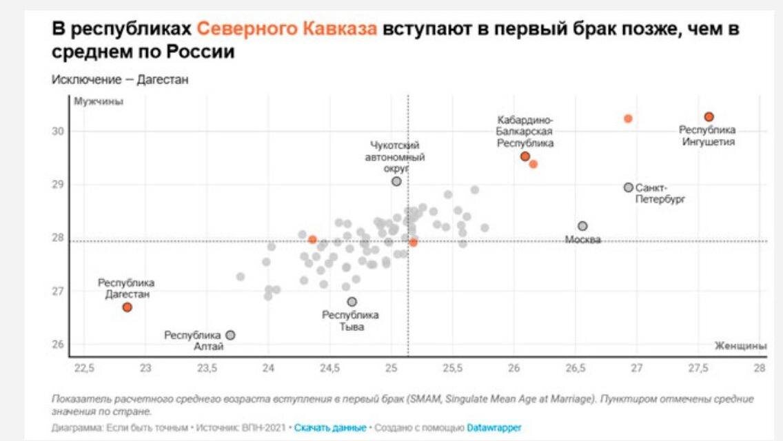 «Президень, говоря о ранних браках, сослался на традиции народов Кавказа Но данные переписи 2021 года показывают обратное Четыре из шести республик Северного Кавказа - в десятке российских регионов, где женятся позже всего Это Ингушетия, Северная Осетия, Кабардино-Балкария и Карачаево-Черкесия Мужчины там вступают в брак в 29-30 лет, женщины - в 26-28 В десятке лидеров также Москва и Санкт-Петербург» Это как раз соотносится с традициями Европы вплоть до XIX века. «Во многих традиционных (а на Кавказе традиционные нормы всё ещё достаточно сильны) брак - это не только про любовь, но и про социальный союз Вопросами выбора невест и женихов занимается в той или иной степени вся семья Родственники решают, подходят ли кандидаты, - в зависимости от положения семьи, перспектив Этот выбор может затянуться, если подходящих кандидатур нет, что и отодвигает возраст вступления в брак Кроме того, у многих народов Кавказа для заключения брака мужчина должен состояться - материально, профессионально,