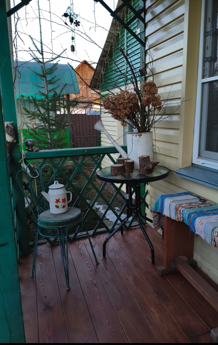 Принесли стул металлический. Когда-то он был синий, потом я его перекрасила в зелёный. После того как он в позапрошлом году всё лето провёл в воде, краска местами облупилась. Вот теперь думаю, в какой цвет покрасить? В зелёный - сливается с решёткой на крыльце. В белый - вообще ни к чему. Может сам каркас в чёрный, как у столика. А сидение в цвет пола на крыльце. В общем пока думаю.