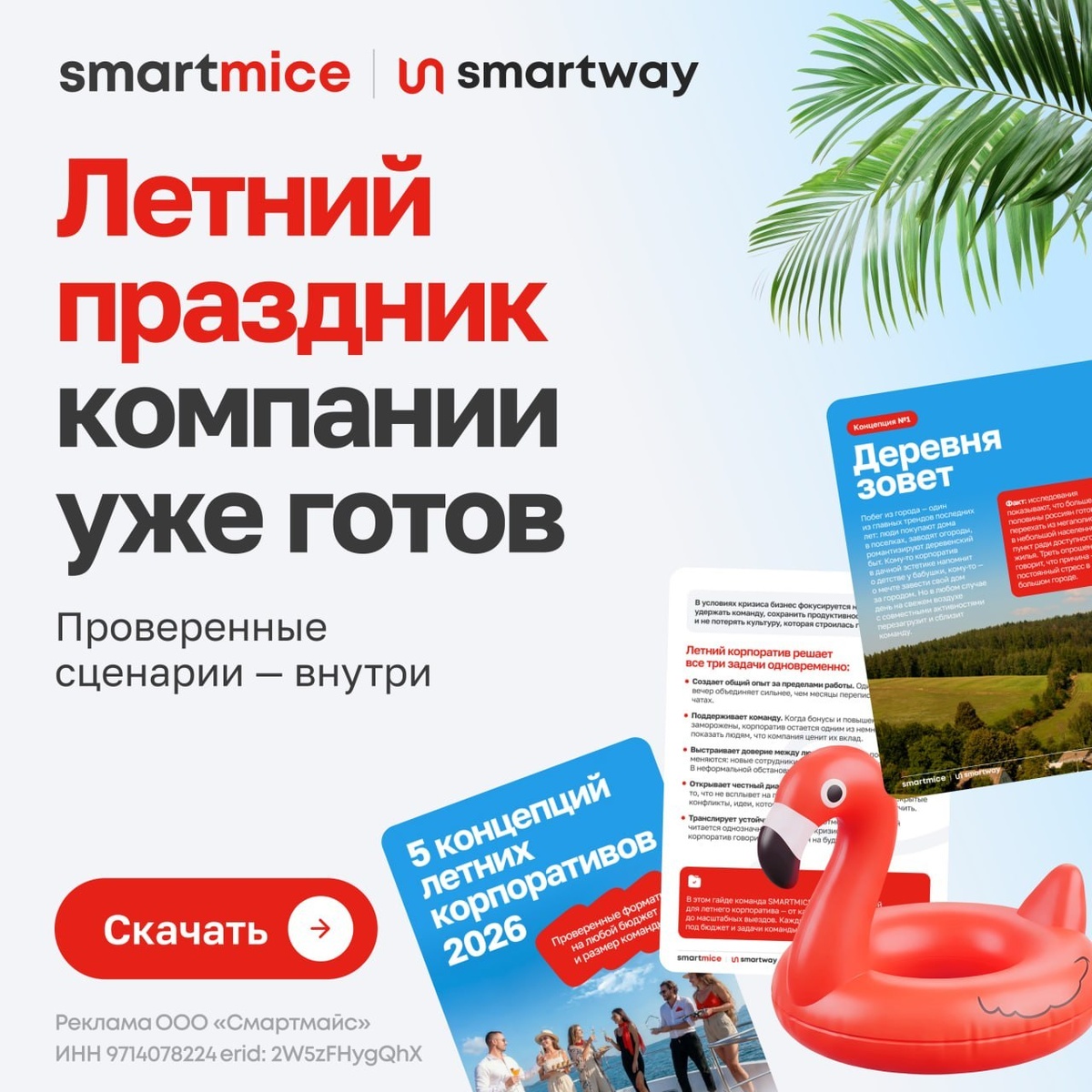До летнего аврала есть время подумать, что нужно именно вашей команде, и выбрать концепцию с правильными смыслами. Команда SMARTMICE уже собрала в бесплатном гайде готовые сценарии летних мероприятий. Внутри: — пять форматов на выбор — можно сразу понять, какой подходит вашей команде, — описание декора, активностей и программы — не нужно придумывать наполнение самим, — готовый материал для встречи с руководством, чтобы согласовать все быстро. Скачивайте и делитесь с коллегами. Скачать бесплатно