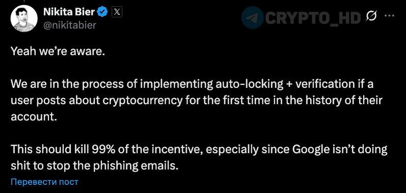 ❌ В Twitter интегрируют защиту от крипто-СКАМА – Nikita Bier Платформа начнет автоматически блокировать аккаунты при первом посте о криптовалюте. Для разблокировки потребуется верификация личности. Мошенники часто взламывают обычные аккаунты и начинают постить крипто-скам (раздачи, инвестиции и т.д.). Теперь такие действия начнут отслеживаться и проверяться. По словам команды Twitter , это может убрать до 99% подобных атак. Crypto Headlines
