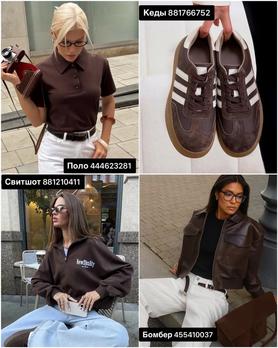На фото собрана очень красивая подборка в благородной шоколадно-кофейной гамме. Это вещи, которые выглядят дорого, актуально и при этом остаются универсальными для повседневной жизни. Здесь есть и аккуратное поло, и стильные кеды, и расслабленный свитшот, и эффектный бомбер, и женственный пиджак, и мини-юбка, и воздушное платье, и изящный топ. Все находки выдержаны в едином настроении: мягкая элегантность, современная женственность и спокойная уверенность.