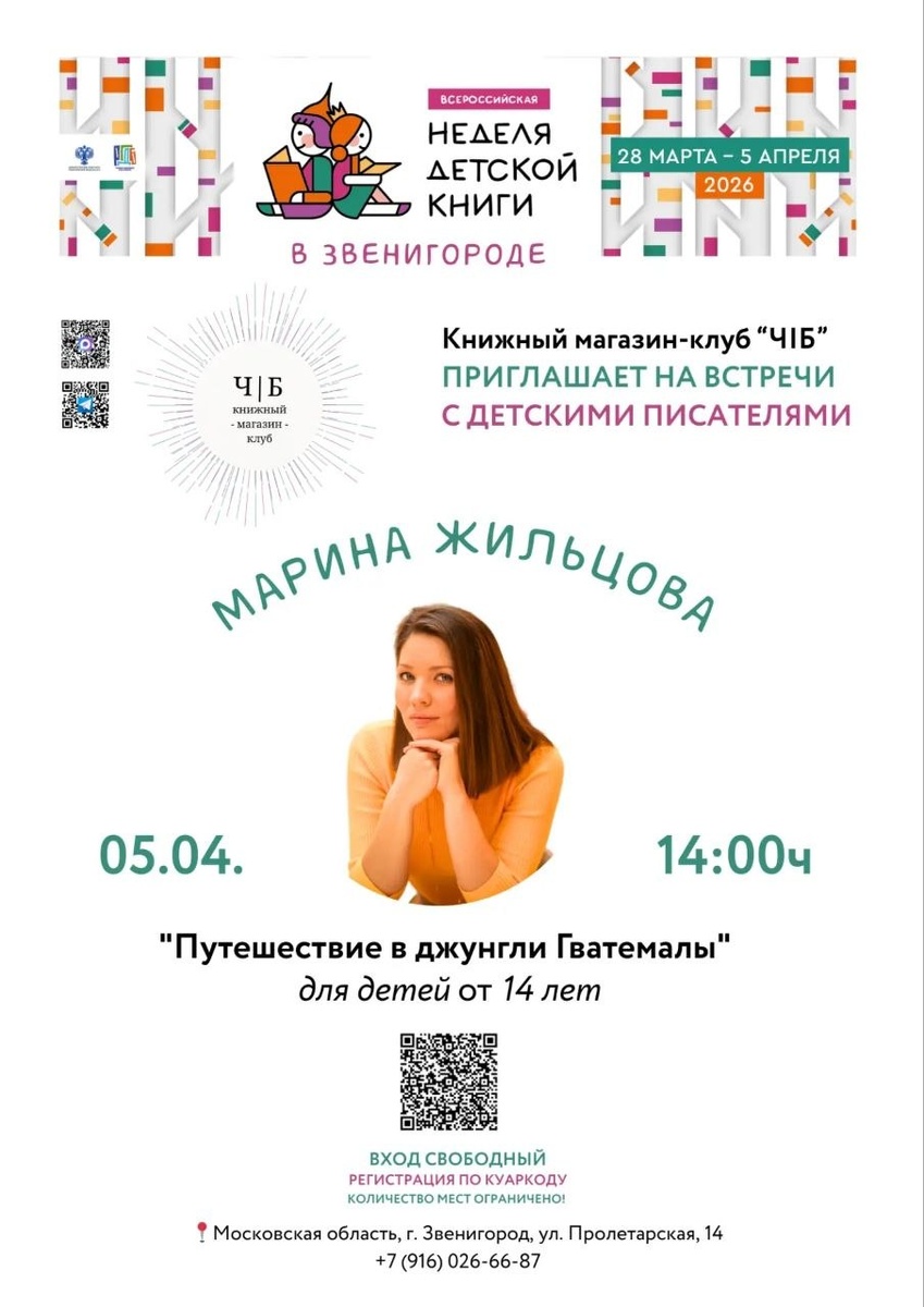 Неделя детской книги в г. Звенигороде, организованная книжным магазином-клубом Ч|Б, идет к завершению. Приглашаем вас на заключительную встречу — с детским писателем Мариной Жильцовой! Тема: "Путешествие в джунгли Гватемалы" Обо всем об этом речь пойдет на встрече с детским писателем Мариной Жильцовой. А ещё участников ждут: После встречи можно сфотографироваться с автором, купить книгу и получить автограф. 5 апреля в14:00ч | Вс Продолжительность: 45 мин 20 мест (свободны 9❗) Приглашаем детей от 14 лет и взрослых ВХОД СВОБОДНЫЙ нужно только ✅ ПОЛУЧИТЬ БИЛЕТ Всё гватемальское в Ч|Б🦧 Адрес: г. Звенигород, ул. Пролетарская,14 Подписывайтесь на наш телеграм-канал 📞+7 (916) 026-66-87 #НеделяДетскойКниги