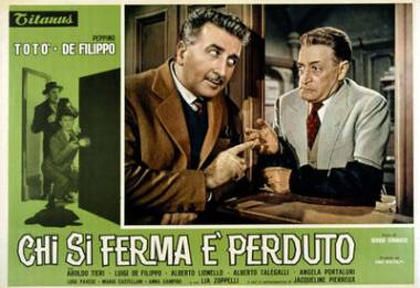 Кто остановится, проиграет / Chi si ferma è perduto. Италия, 1960. Режиссер Серджо Корбуччи. Сценаристы: Бруно Корбуччи, Джованни Гримальди, Марио Герра, Лучано Мартино, Дино Ди Пальма. Актеры: Тото, Пеппино Де Филиппо, Арольдо Тиери и др. Комедия. Премьера: 16.12.1960. Прокат в Италии: 1,5 млн. зрителей. Двое служащих соперничают друг с другом, чтобы произвести наилучшее впечатление на своего нового босса… Все предыдущие фильмы Серджо Корбуччи не стали чемпионами проката. Нужно было искать какой-то иной путь. И Серджо Корбуччи решил сделать ставку на тогдашнего итальянского комика № 1 Тото. Комедия «Кто остановится, проиграет» открыла целую серию комедий Корбуччи с участием Тото… В год выхода этой комедии на экраны Италии пресса, отмечая те или иные недостатки ленты, все-таки оценила ее без гнева: «Фильм, эксплуатирующий обычные клише фарсового жанра и характеры двух главных героев, довольно многословен и весьма скромен» (Segnalazioni cinematografiche. 49. 1961). «Уморительная дуэль