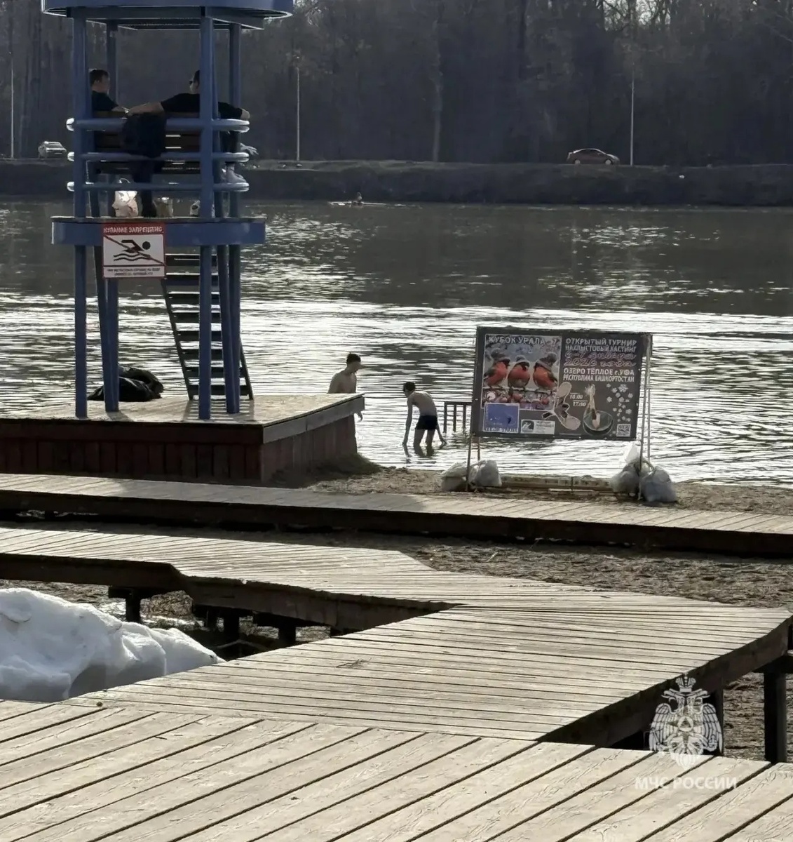 В Уфе подростки «открыли купальный сезон». И плещутся на озере Тёплом в Инорсе. Об инциденте сообщили в ГУ МЧС РФ по РБ. И добавили: «А местные «спасатели» на вышке внимательно наблюдают за происходящим...» На пляже, между тем, ещё лежит снег. И температура воды ещё очень низкая. МЧС предупреждает: купаться в апреле нельзя, даже если очень хочется и солнышко припекает. Местами на реках ещё стоит лёд. Резкий перепад температур может привести к судорогам, остановке дыхания или сердечному приступу.