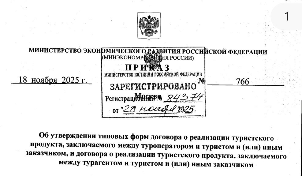 ▪В Минюсте вчера зарегистрирован Приказ Министерства экономического развития Российской Федерации от 18.11.2025 № 766 "Об утверждении типовых форм договора о реализации туристского продукта, заключаемого между туроператором и туристом и (или) иным заказчиком, и договора о реализации туристского продукта, заключаемого между турагентом и туристом и (или) иным заказчиком". Файл прилагается Источник Безопасность туризма t.me/tourismsafety #кбр #туризм #туризмкбр #договор #турист #турист