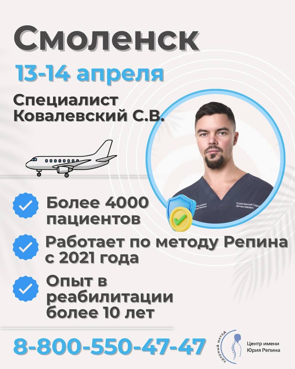 Остались последние окна Мы уже едем в СМОЛЕНСК и запись активно заполняется. Но ещё есть свободное время 👇 📍 СМОЛЕНСК 📅 13–14 апреля Адрес: НОВЫЙ – Смоленск ул..100 летия Комсомола 1, студия красоты «Capsula». Ориентир магазин «Магнит», проходите вдоль дома и до вывески салона. ⏰ Свободные окна 📅 13 апреля ✅ 9:00-11:00 ✅ 11:30-12:30 ❗ 12:30 – 14:30 — занято ✅ 14:30-15:00 ✅ 16:00 ✅ 17:00 ⸻ 📅 14 апреля ✅9:00-11.00 ❗️11:00-12.30 - занято ✅12.30-13.00 ❗️13:00 – 15:30 — занято ✅15:30-16:30 ⸻ Приём ведёт Ковалевский Сергей Вячеславович — Более 4000 пациентов с улучшением состояния — Работает по методу Юрия Репина с 2021 года — Опыт в кинезиотерапии и реабилитации — 10 лет 📩 Записаться: http://n458139.yclients.com/ 📩 Если у вас другой город: https://centrrepina.bitrix24site.ru/crm_form_cvizy/?utm_source=telegram ☎️ 8-800-550-47-47 🌍 +7 (499) 390-17-90 ❤️ Если откладывали — сейчас тот момент когда ещё можно попасть в этот приезд