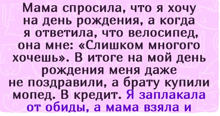 - Мама спросила, что я хочу на день рождения, а когда я ответила что велосипед, она мне: «Слишком многого хочешь». В итоге на мой день рождения меня даже не поздравили, а брату купили мопед. В кредит. Я заплакала от обиды, а мама взяла и дала мне подзатыльник, а потом сказала, что я жадная и дрянная девчонка. Вот так! Мне 46. До сих пор обидно.