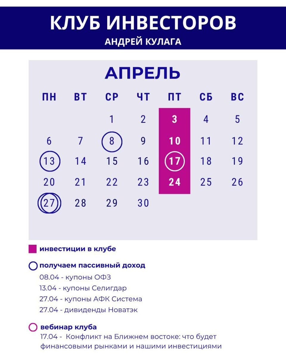 Вижу, что у нас 4 выплаты будет в этом месяце. Думаю, что-то мало. Ловлю себя на этой мысли, и такой сразу стоп! Вообще-то, когда только начинали инвестировать в клубе, 1-2 выплаты в месяц было уже неплохо. А тут 4 и уже мало. Понимаю, что к хорошему быстро привыкаешь, например, когда в январе у нас было рекордных 9 выплат. Да многим зарплата приходит реже, чем нам пассивный доход. Теперь задача, чтобы и суммы выплат по нему были приличные - я над этим тоже работаю. А с мая у нас начнется дивидендный сезон, когда компании будут массово выплачивать дивиденды своим акционерам. Интересно, получится ли установить новый рекорд клуба😏 Понятное дело, что у новых участников клуба, которые только присоединились, не будет сразу столько выплат, ведь мой портфель создавался 3,5 года. Но даже они смогут получить свои первые дивиденды уже в ближайший месяц. В этом тоже ценность #КлубАндреяКулаги: даже если присоединился позже, это не значит, что поезд уже ушел. Мы регулярно докупаем бумаги, поэ