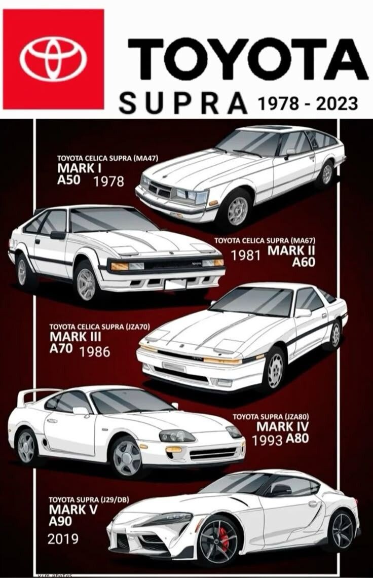 Toyota Supra — это не просто спорткар, а символ японской мощи 1990-х и возрождения в 2010-х. История началась в 1978 году, когда Toyota выпустила Celica Supra (A40/A50) — удлинённую версию Celica с шестицилиндровым двигателем вместо четырёхцилиндрового. Но настоящая Supra родилась в 1986 году с выходом модели A70.