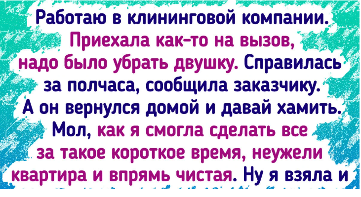 - Работаю уже несколько лет в клининговой компании. Приехала как-то на вызов, надо было убрать двушку. Справилась за полчаса, сообщила заказчику. А он вернулся домой и давай хамить. Мол, как я смогла сделать все за такое короткое время, неужели квартира и впрямь чистая. Ну я взяла и ответила: «Я выполняю работу за полчаса, потому что я пять лет училась справляться с этой работой за полчаса. Вы платите мне за эти годы, а не за 30 минут!» Он проверил все помещение, не нашел, к чему придраться, молча заплатил, и я уехала. Бесят такие.