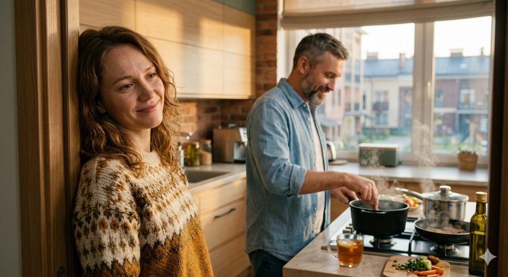 В гостиной Андрей разогревал ужин и что-то рассказывал про дочь — та снова заявила, что книга «ничего, но концовка слабая». Светлана вышла из комнаты и остановилась в дверях кухни, глядя на него.