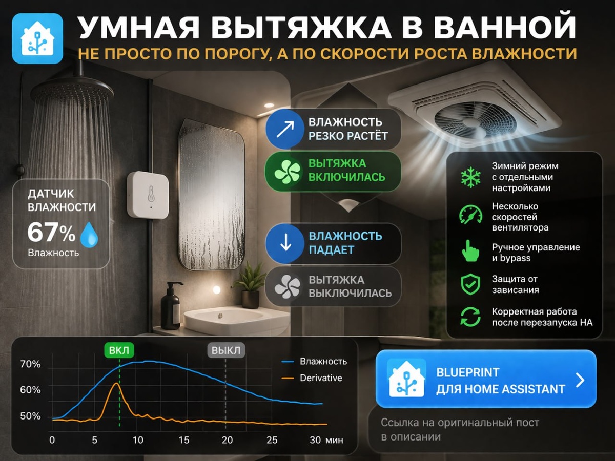 🚿 Нашёл классный #blueprint для вытяжки в ванной Не по тупому порогу влажности, а по скорости её роста. То есть #HomeAssistant понимает, что вы реально пошли в душ, и включает вытяжку вовремя. > Влажность резко пошла вверх → вытяжка включилась > Влажность пошла вниз → вытяжка выключилась с задержкой Что есть внутри 👇 • работа через Derivative Helper • отдельные настройки под зиму • поддержка нескольких скоростей вентилятора • ручное управление и bypass • защита от бесконечной работы • нормальная логика даже после перезапуска #HA Мне такие автоматизации нравятся намного больше, чем банальное: “если влажность > 70%, включить вентилятор” 😄 🔗 Ссылка на blueprint: community.home-assistant.io/t/bathroom-humidity-exhaust-fan/509992 ➕ Импортнуть в HA 👍 #HomeAssistant #умныйдом #blueprint #ванная #вытяжка #автоматизация