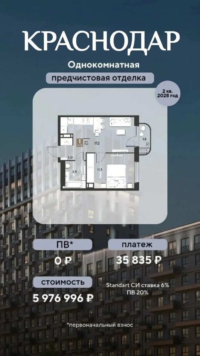 Я знаю, как многие из вас мечтают о своей квартире на юге! Прекрасная возможность купить без первоначального взноса! Застройщик - самый крупный на юге, объекты сдаются вовремя.