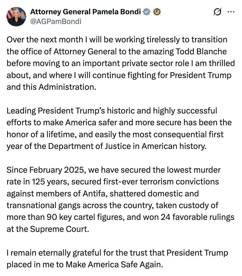 Pam Bondi says she will ‘CONTINUE FIGHTING FOR PRESIDENT TRUMP AND THIS ADMINISTRATION’ in new private sector role after FIRING